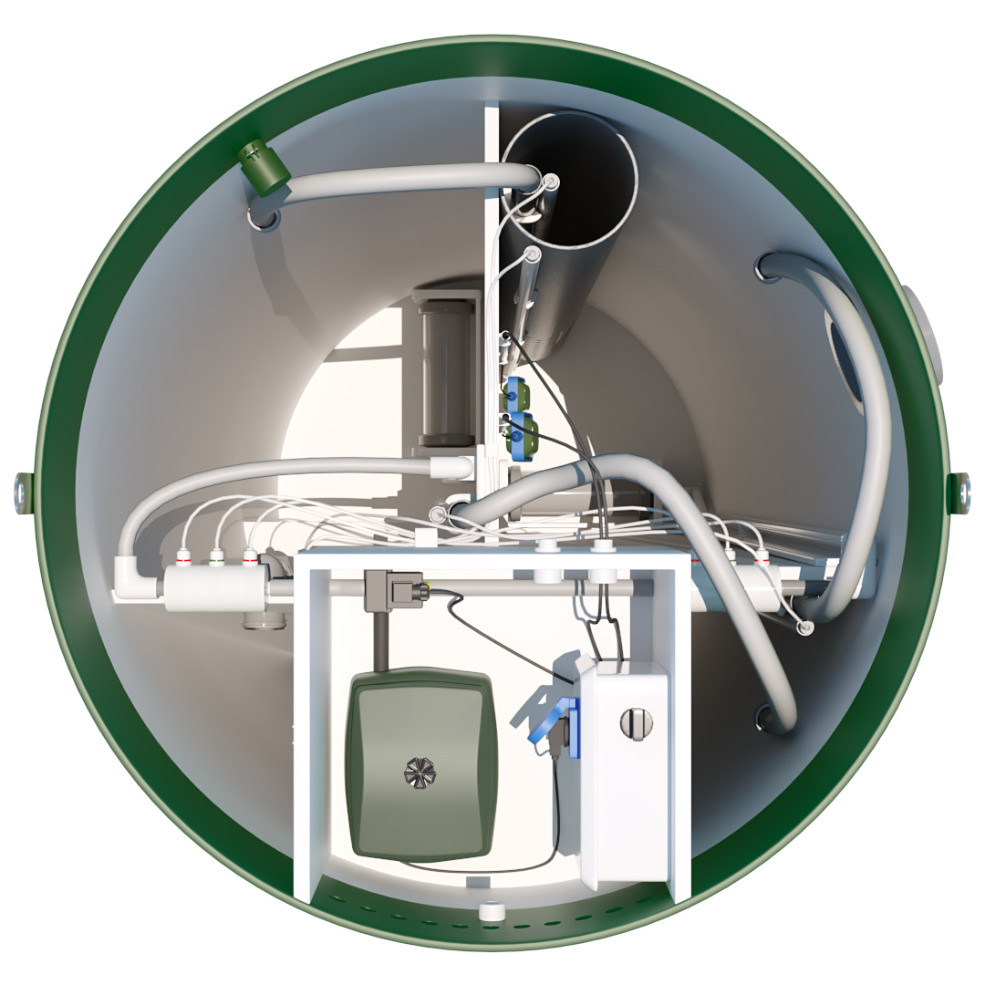 Распределительно-регулировочный узел размещён на внешней стороне стенки камеры с компрессорами. Из него идут воздуховоды к каждому потребителю станции автономной канализации.